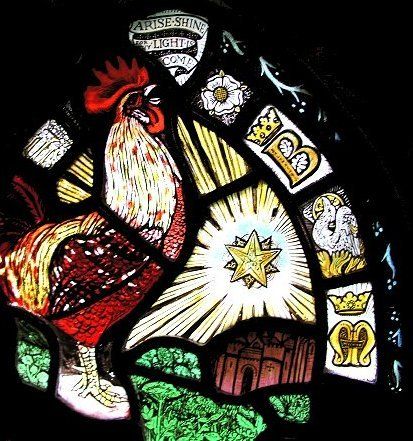 The scene at the top of the Epiphany Window showing a cockerel, star, a phoenix, and the letters B and M.